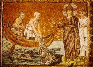 San Apollinare Nuovo Basilica mosaic, Christ (haloed) with Peter and Andrew, 6th c.